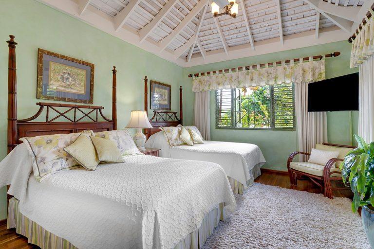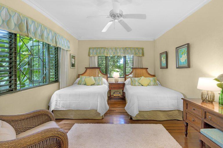 Bedroom 5 Ground Level, Garden View, 2 Double Beds, Air-Conditioned, Ceiling Fan, Flat Screen TV & Cable, En-suite Bathroom